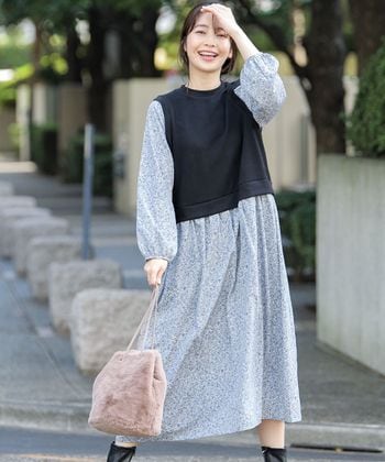 ワンピースに合わせてガーリィにしても、オーバーオールコーデを大人っぽく格上げするのにもピッタリ! 『ファーフラップショルダー』¥2280 ・ 『vネックワンピース』¥3480 ・5⑧ 『快適クッションパンプス』¥1980 ・⑥